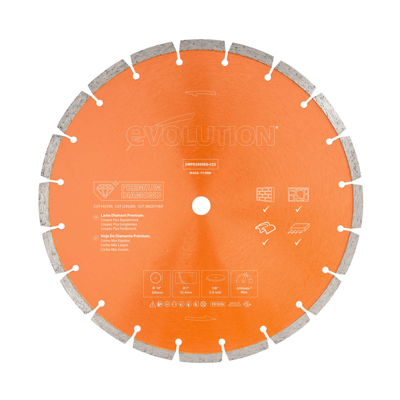 I lavori di taglio più impegnativi richiedono lame all’altezza. Il disco diamantato Premium Evolution è arricchito con una concentrazione ancora maggiore di diamante per garantire tagli ripetuti anche nelle condizioni più difficili. Progettato per tagliare qualsiasi tipo di materiale da costruzione – mattoni, blocchi, pietra decorativa, cemento armato con tondini in acciaio – è ideale anche per metalli duri come barre d’armatura, travi RSJ e tubi in ghisa.