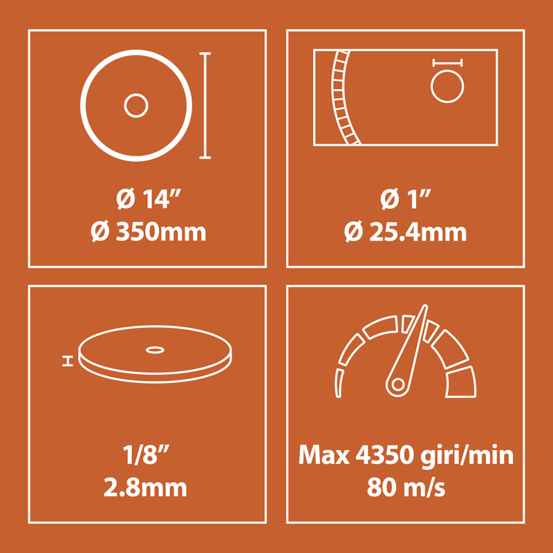 - Utilizzabile su seghe da taglio ad alta velocità da 350 mm (13,7”), seghe per muratura e seghe semoventi a bassa potenza.