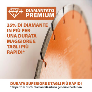 I dischi Premium Diamantati sono le più resistenti della gamma Evolution: contengono fino al 30% di diamante in più rispetto ai dischi standard, durano più a lungo e garantiscono tagli più rapidi. Se consideri il costo in rapporto alla durata, non c’è paragone.