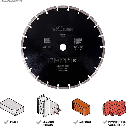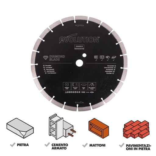 Disco diamantato per demolizione multi-materiale, segmentato, 300mm, alesaggio 22,2mm, Evolution per troncatrici per calcestruzzo