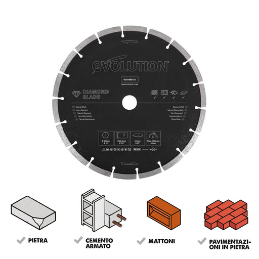 Disco diamantato Evolution da 210 mm con alesaggio da 25,4 mm per troncatrice radiale / a trazione e sega da banco