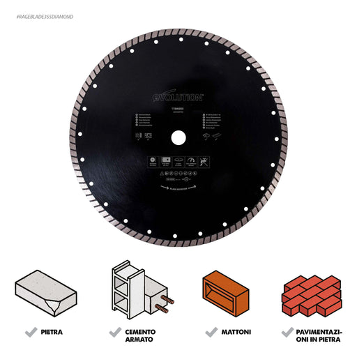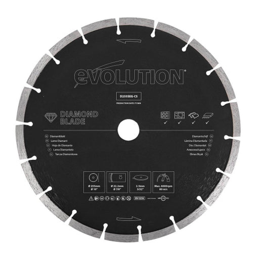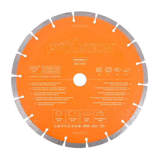 Disco diamantato per demolizione multi-materiale, segmentato, 255mm, alesaggio 22,2mm, Evolution per troncatrici per calcestruzzo