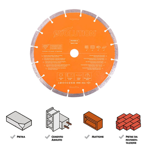 Disco diamantato per demolizione multi-materiale, segmentato, 230mm, alesaggio 22,2mm, Evolution per troncatrici per calcestruzzo
