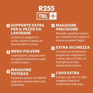 La R255TBL+ è progettata per durare e offrire prestazioni di taglio multi-materiale superiori. Potente, precisa, sicura e facile da installare, è la scelta definitiva per i professionisti e gli appassionati del fai-da-te.