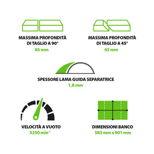 - Profondità di taglio: 85 mm a 90° e 65 mm a 45° per massima flessibilità.