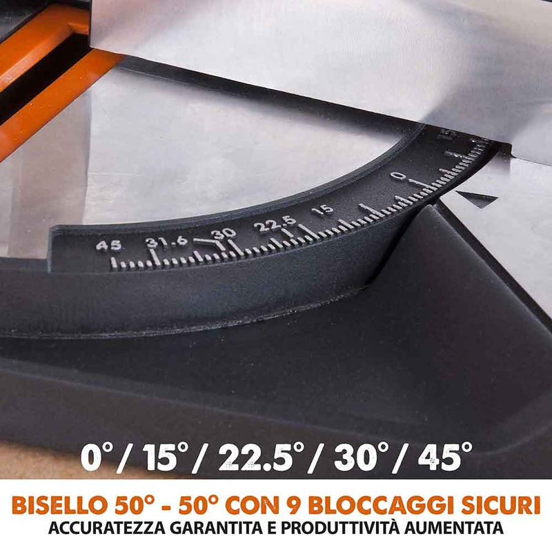 - Regolazione dell’angolazione 45°-45°, fermi angolari preimpostati e lama di alta qualità per risultati sempre perfetti.