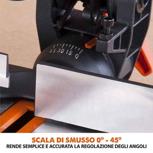 - Taglio preciso – Ghiera inclinabile da 0° a 45° e regolazione dell’angolazione da 45° a 45°.