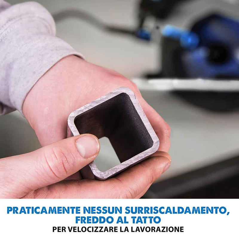- Tagli precisi e puliti sul metallo, senza produrre scintille o sbavature.