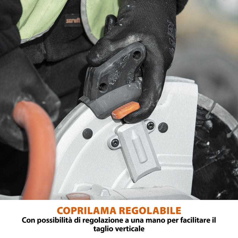 - Tagli Precisi e Sicuri: La piastra di protezione su ruote facilita i tagli al pavimento, mentre il freno elettronico assicura la massima sicurezza.