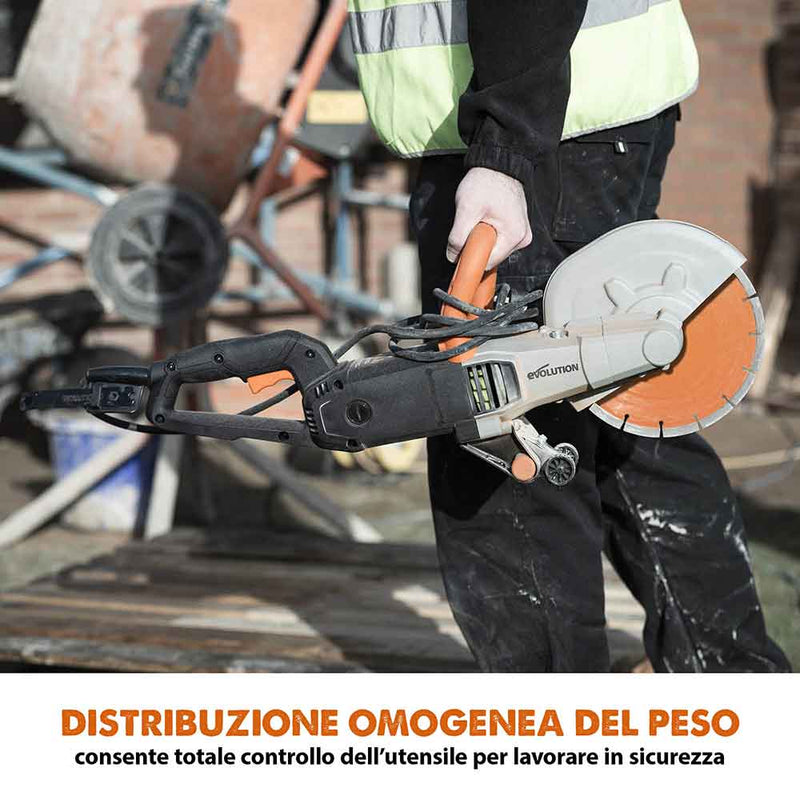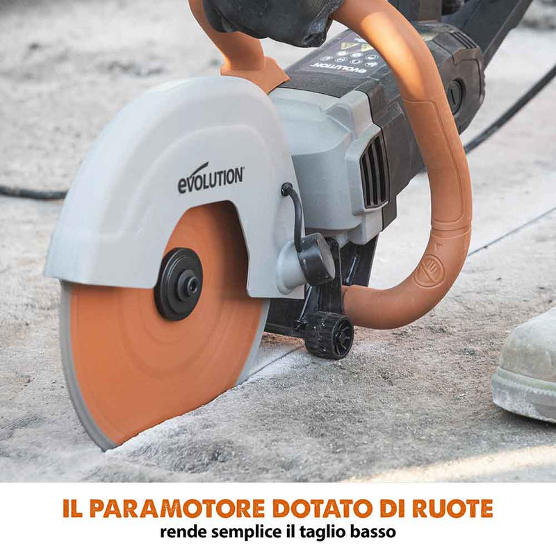 Equipaggiata con un disco diamantato premium Evolution con una concentrazione di diamante del 30% in più rispetto li standard, questa troncatrice assicura tagli rapidi e duraturi.