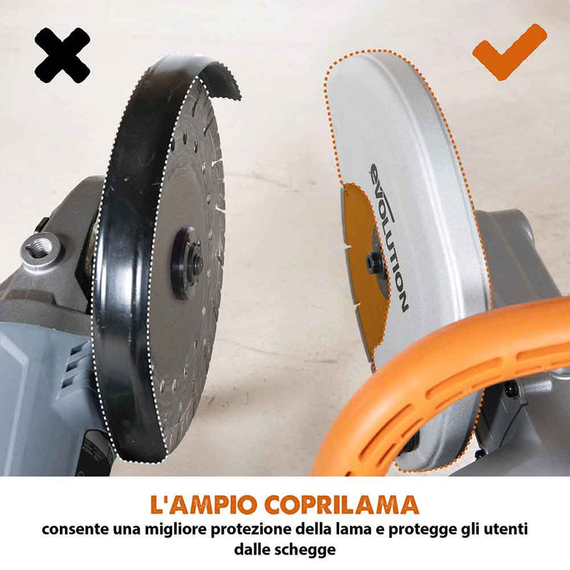 - Sicurezza e affidabilità: La piastra di protezione rinforzata ti consente di lavorare con fiducia su qualsiasi superficie. L'angolo elevato mantiene la lama sollevata, permettendoti di posare la troncatrice immediatamente dopo l'uso.