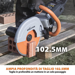 La Sega Elettrica per Cemento Evolution R255DCT trasforma il tuo modo di lavorare! Con una profondità di taglio di 102,5 mm, puoi affrontare anche mattoni più spessi in un solo passaggio, semplificando la lavorazione di calcestruzzo e pietra.