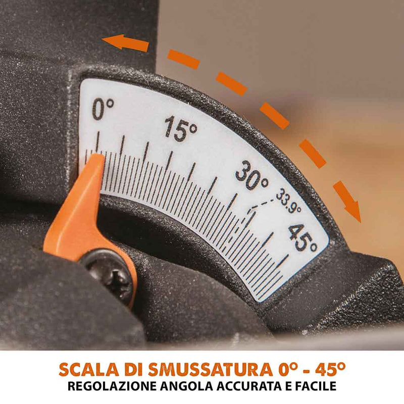 Con una capacità massima di taglio trasversale di 210 mm x 55 mm, inclinazione smussata da 0° a 45° e angolo di taglio regolabile da -50° a +50°, affronta senza problemi modanature, battiscopa, cornici e lavorazioni di finitura.