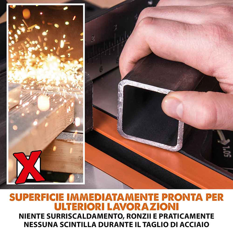 La guida laser integrata e i 9 fermi angolari positivi ti garantiscono tagli perfetti, veloci e ripetibili, mentre il sistema di scorrimento fluido ti permette di lavorare anche su pezzi più grandi senza sforzo.