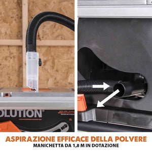 - Gestione della Polvere Efficiente: Sistema integrato sopra e sotto la lama, compatibile con aspiratori (venduti separatamente).