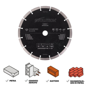 Disco diamantato ad alte prestazioni, in grado di tagliare tutti i tipi di muratura, compreso il cemento armato con barre di armatura in acciaio.